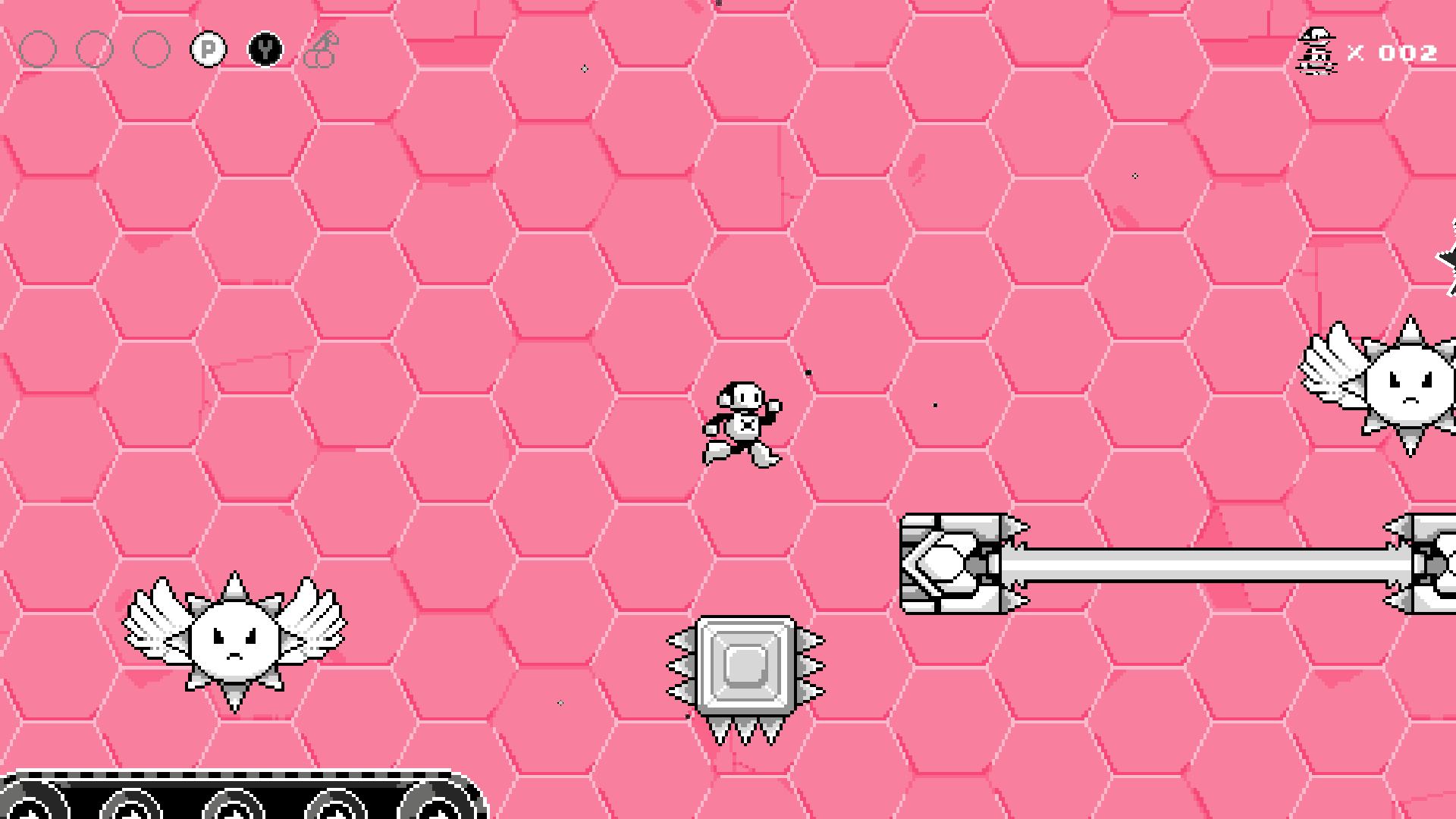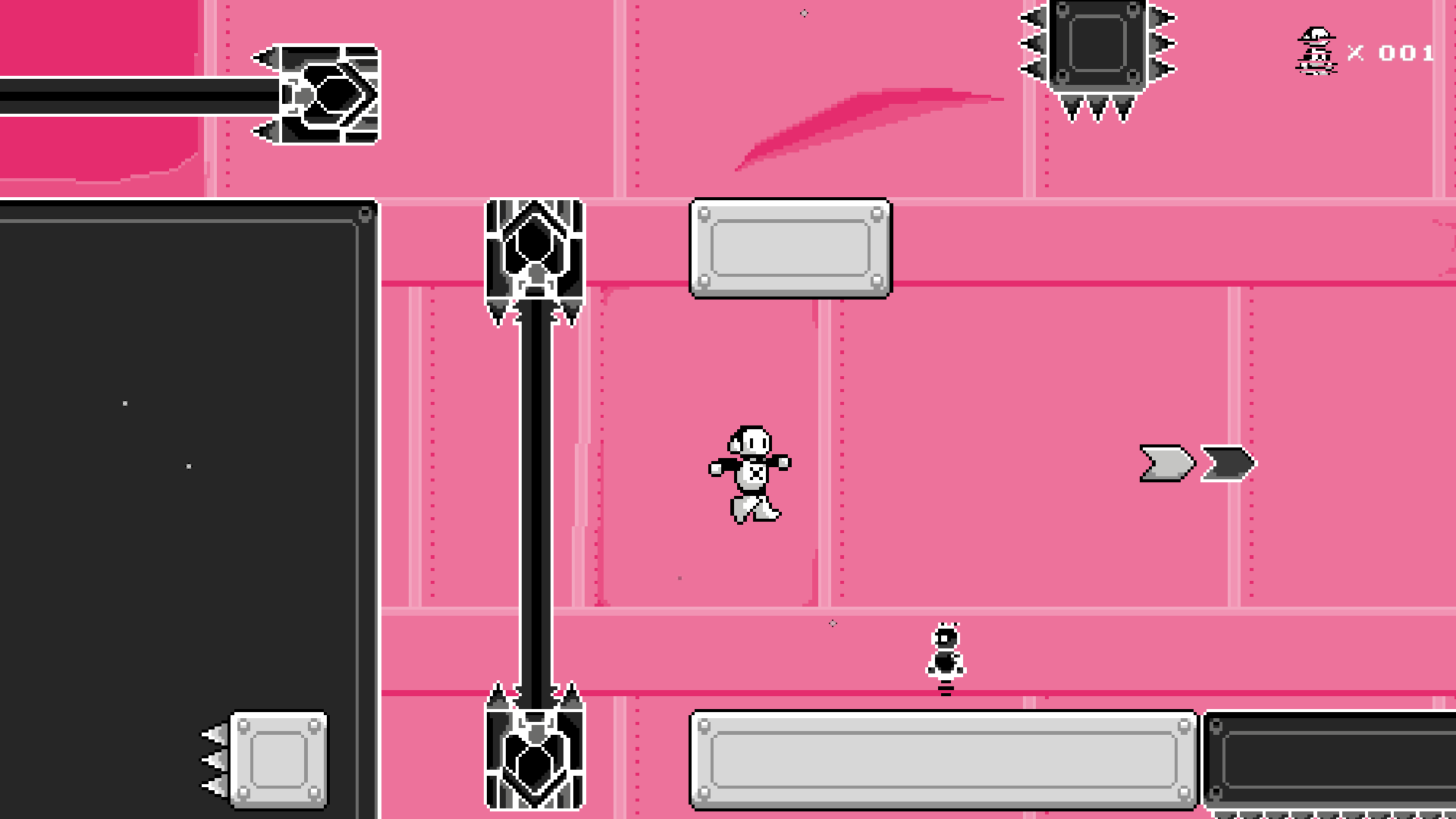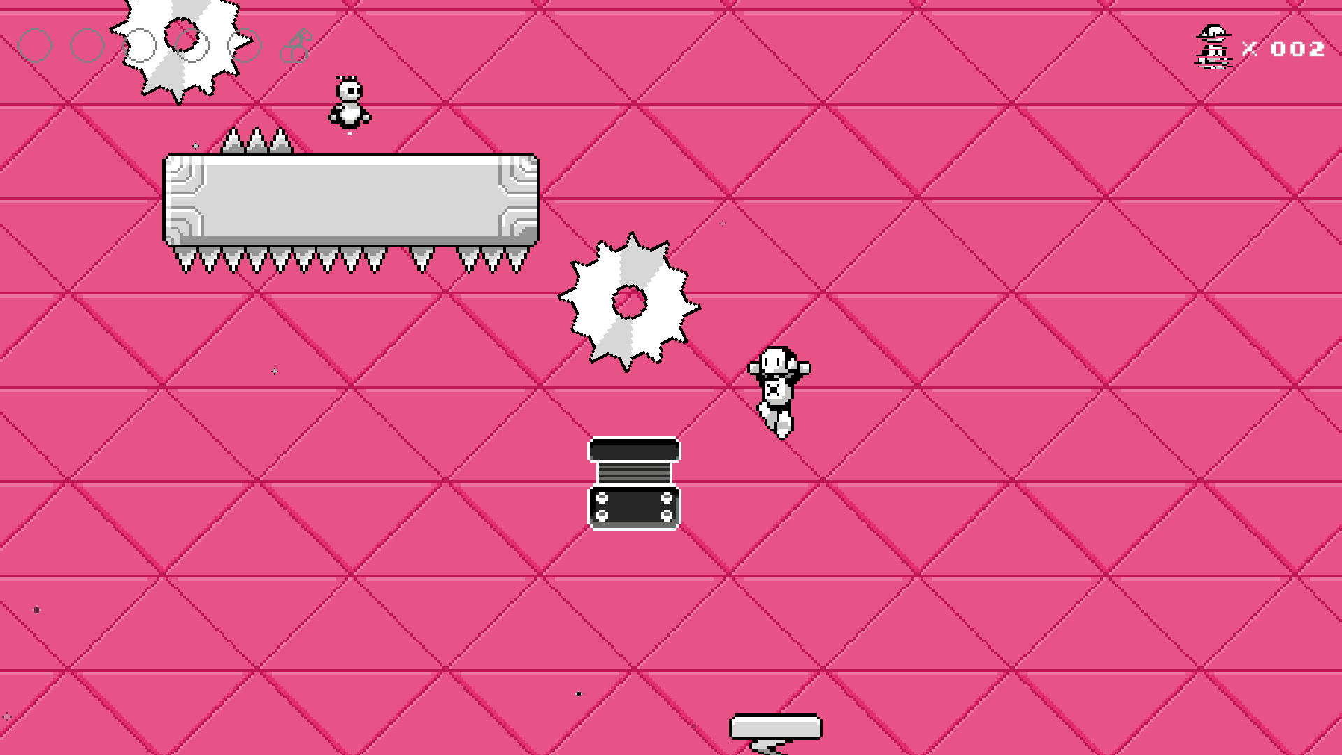 Traditional tough-as-nails platforming meets a novel phase mechanic where players must swap between black and white to avoid hazards and land on platforms.
